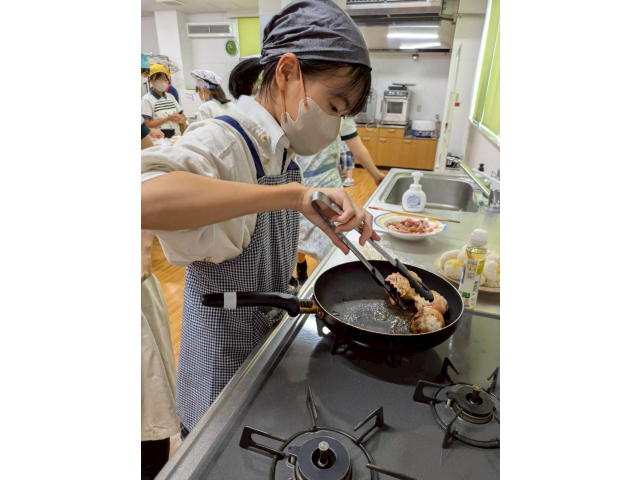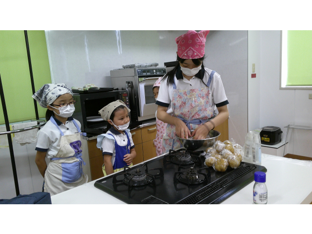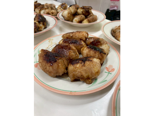 シニアは、俵型のおにぎりを作り、豚バラ肉を巻いて