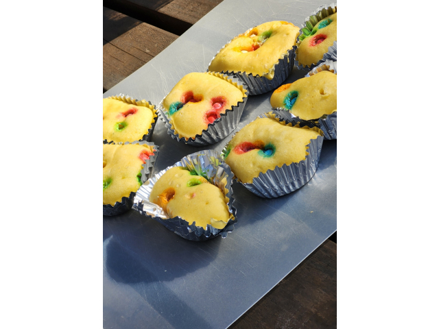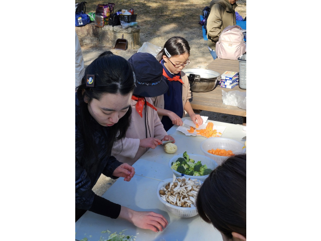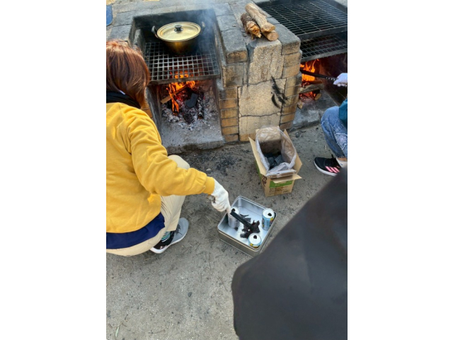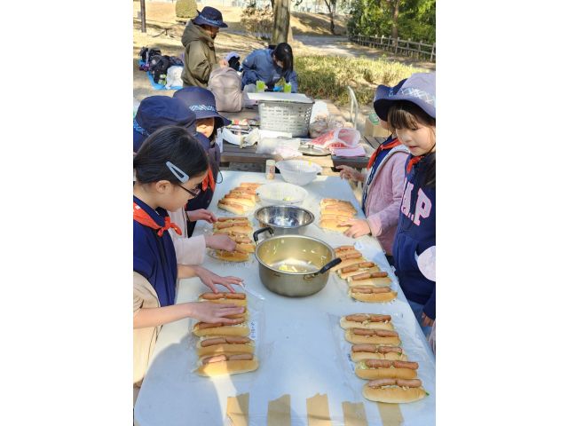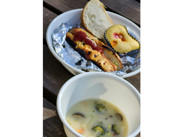 昼食メニューは、クリームシチュー、牛乳パックでカートンドッグ、