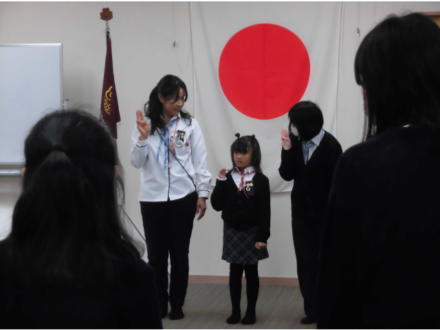 ・ブラウニー部門に新しいお友達が入ってくれました。何度か一緒に活動をして慣れてきたところで、入団式を行いました。自己紹介をした後、赤いチーフとピンをつけ、ガールスカウトのやくそくをリーダーと一緒に唱和しました。