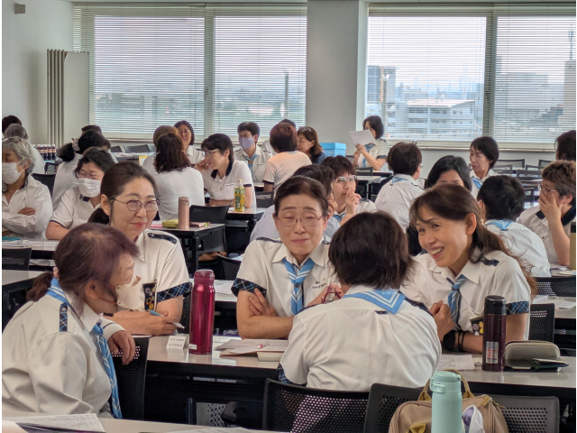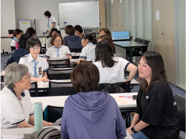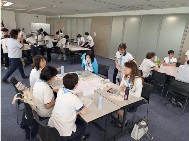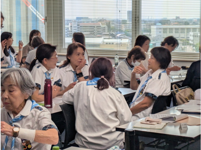 午後は研修「数字で見る愛知県連盟会員の今」で会員数の推移や部門毎の継続率を知りました。その後、団運営者とリーダーに分かれてそれぞれで5~6名のグループを作り、団運営者グループでは保護者を巻き込む企画の立案、リーダーグループではジュニアからシニア・レンジャーへフライアップしたくなる活動体験プログラムの立案をしました。
