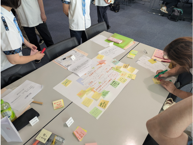 グループごとに企画シートを作り、各グループのシートが完成したところで、グループの枠を越えて全員でほかのグループのシートを見て回り、付箋でコメントを残しました。